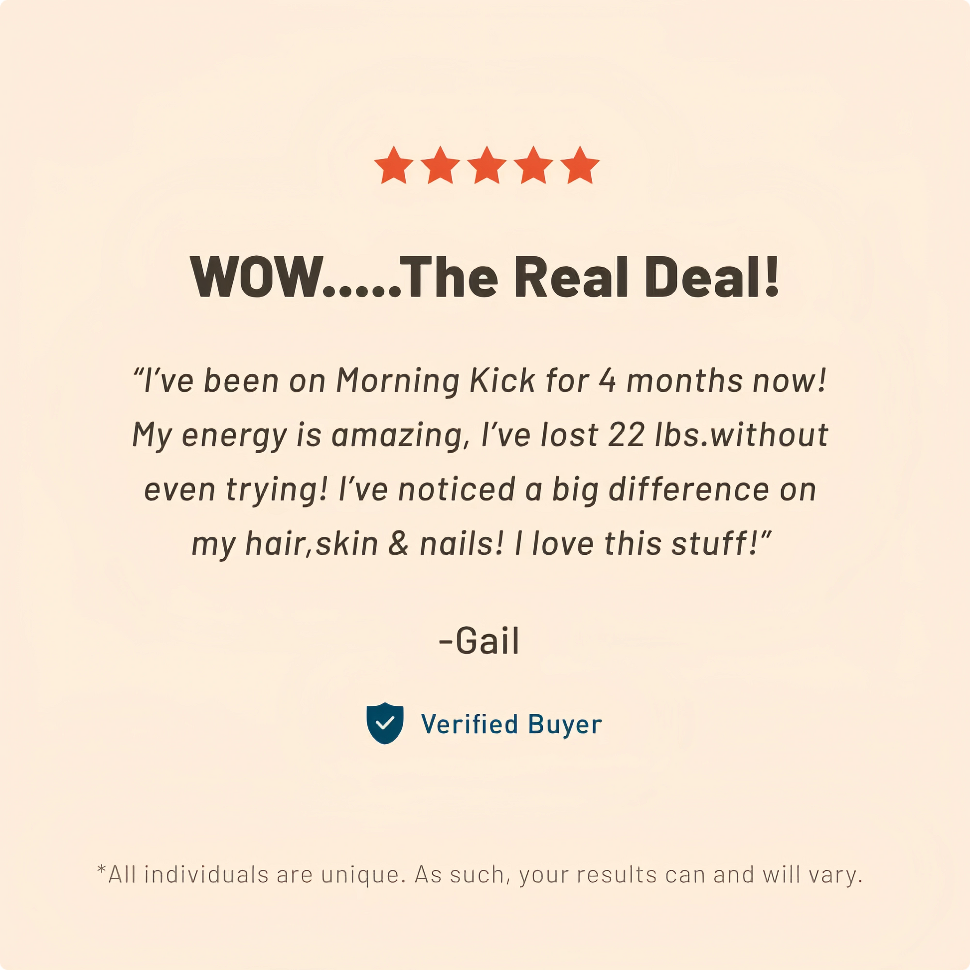 **4 week study of 23 respondents ages 40-75, using the product Morning Kick®. Respondents were compensated to share their experiences. Not a scientific study. Individual results can and will vary.